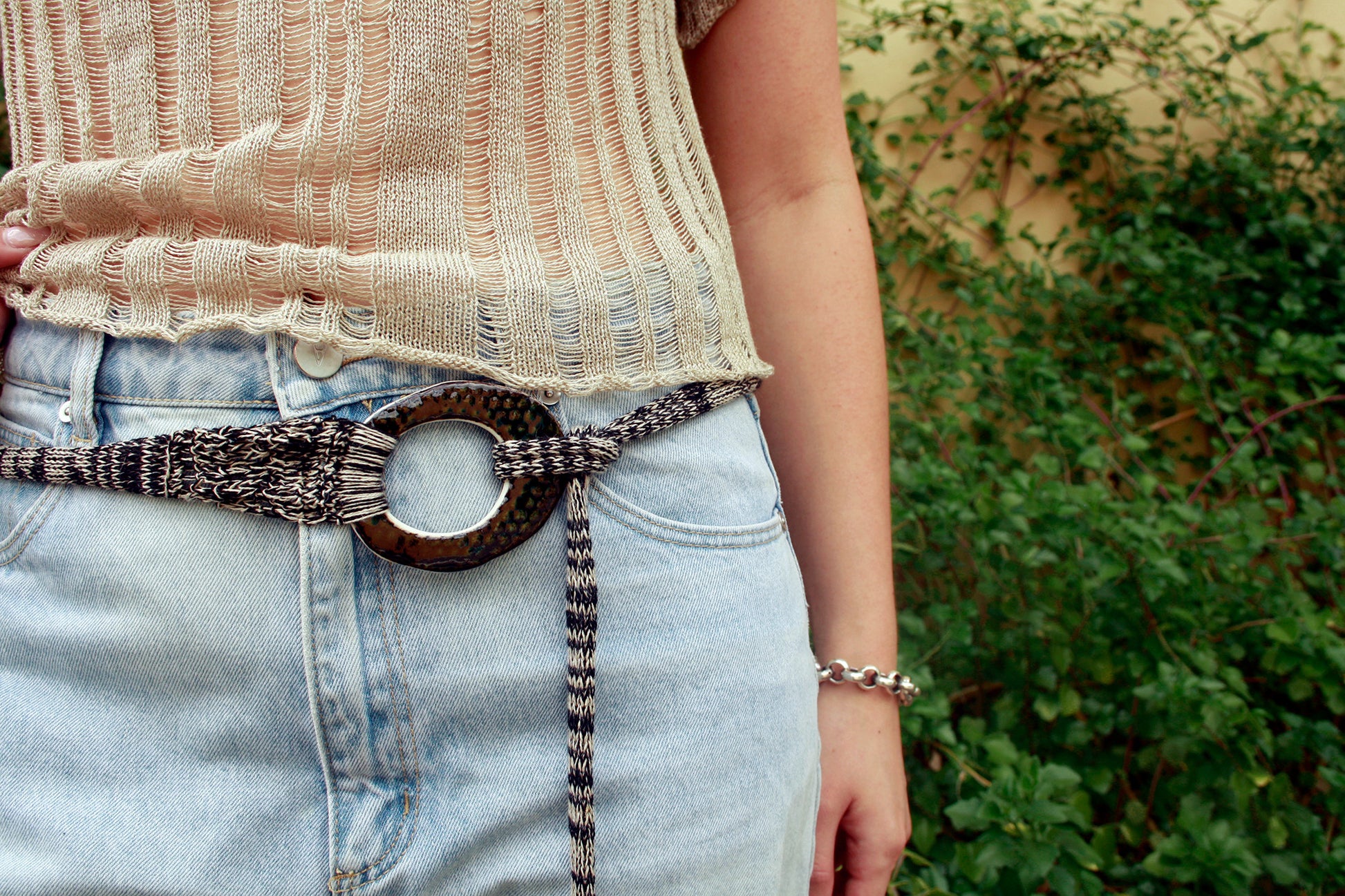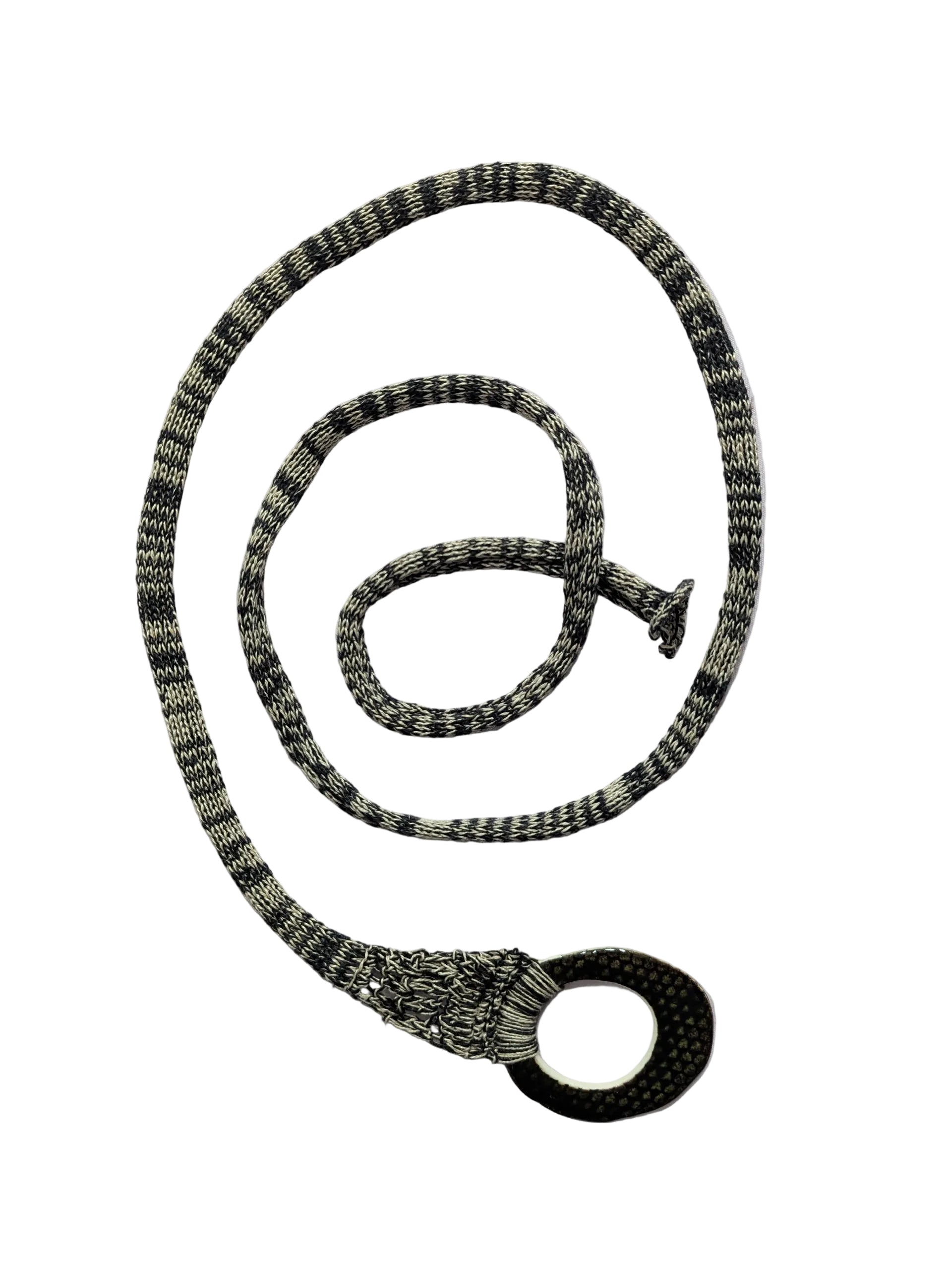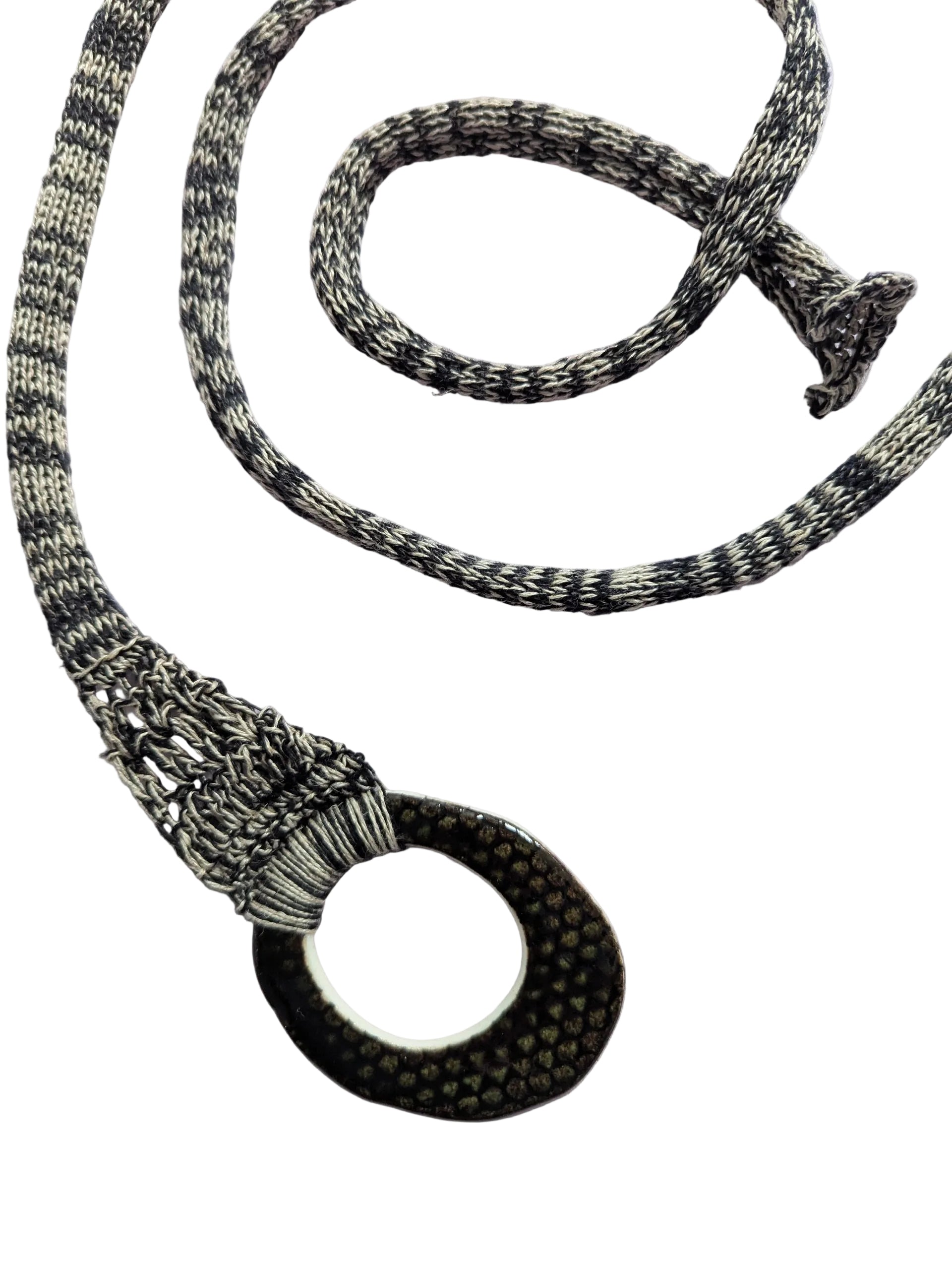 A delicate hand-built porcelain moon, wrapped in organic linen using a combination of free-form crochet and knitting. Tie and wear in multiple ways.
